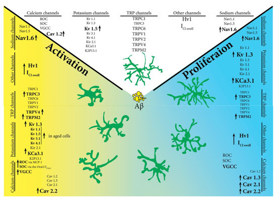 Microglia are found in all brain structures but in some regions their density is higher [24]. In AD, numerous activated microglia can be found in the hippocampus which is the most affected region of the brain [25]. A study conducted on isolated microglia, showed that only Kv1.3 channels have a direct role in cell proliferation. Of note, Kv1.5 channels are not involved in this process [26]. On the contrary, it seems that Kv1.5 channels predominate in surveillance microglia (M2 phenotype) while activated microglia switch to Kv1.3 channels [27]. However, since potassium channels have multiple functions and are found in all cells of the human body, these observations may be just the tip of the iceberg. These channels activation causes cell membrane hyperpolarization which in turn lead to calcium influx by activating calcium channels [28,29].