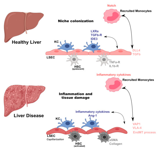 Moreover, during NASH and liver fibrosis, LSECs fail to maintain KCs and hepatic stellate cell quiescence, resulting in KCs activation, which, in turn, maintains liver injury and potentiates liver fibrosis from recruitment and adhesion to leukocytes [54,67].