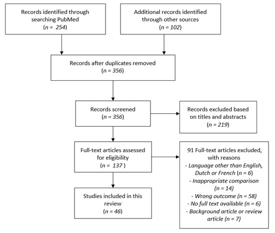 We identified 356 articles of which 137 articles were selected as possibly relevant. After examination of the full text, 46 studies were included in the current review (Figure 1).