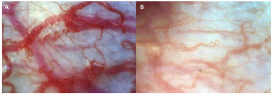 Capillaroscopic gingival microcirculation pictures of chronic generalized periodontitis subject (A) and healthy subject (B) (original magnification × 300).