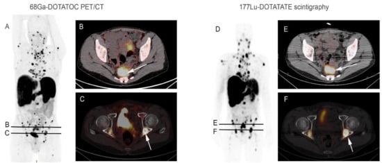A 65-year-old man with metastatic well-differentiated grade 2 rectal neuroendocrine tumor, progressive after chemotherapy, addressed for PRRT. 68Ga-DOTATOC PET/CT maximum intensity projection image (A) and axial fused PET/CT images (B,C) showed high multiple focal uptakes, corresponding to mediastinal, abdominal lymph nodes, liver and bone lesions ((C) arrow: example of bilateral cotyle posterior wall lesions) associated with a large rectal lesion ((B) arrow). Post 177Lu-DOTATATE therapy whole-body image (D) after the first administration showed focal tracer uptake in all lesions correlating with 68Ga-DOTATOC PET/CT images, as observed in fused SPECT/CT images (E,F).