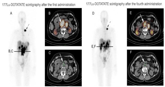 A 54-year-old woman with metastatic well-differentiated ileal neuroendocrine tumor, progressive under somatostatin analogs, addressed for PRRT. Post 177Lu-DOTATATE therapy whole-body image after the first administration (A) showed multiple foci of uptake including a large left subclavicular node (dotted arrow), liver lesions and large retroperitoneal lymph nodes (arrow) as illustrated in axial SPECT/CT fused (B) and CT (C) images. After the fourth administration, the treatment scintigraphy already detected partial response, with a decreased uptake in several lymph nodes (D), particularly in subclavicular (dotted arrow) and para-aortic sites (arrow), also associated with decreased in size, as demonstrated in axial SPECT/CT fusion (E) and CT (F) images.