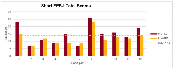 Participants’ mean short FES-I score decreased from 15 at pre-test to 12 post-test, corresponding to a mean relative decrease of 20% in the fear of falling score. Notably, 7 out of 11 (64%) participants had lower FES-I scores at post-intervention as compared to pre-test (see Figure 1).