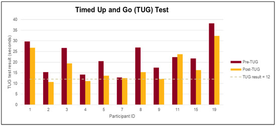 Timed Up and Go (TUG) ≥ 12 s indicates high risk for falling; n = 11. Longer times indicate higher risk for falling.