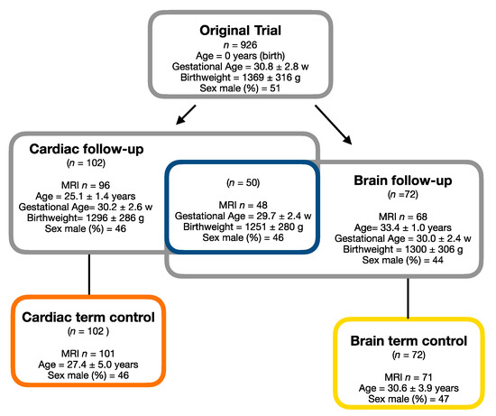 Fifty of the preterm subjects were included in both the cardiac and the brain MRI follow-up studies (Figure 1). The data from this preterm group is used in all analyses in this study.