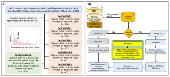 To date several predictive models of recurrent stroke, using regression or other statistical methods, have been developed; however, the clinical utility of these models tends to be limited due to the narrow scope of variables used in these models [6]. In a recent study, multivariable logistic models of 1-year stroke recurrence, developed based on 332 patients, using clinical and retinal characteristics (using 20 variables) have shown promising results with an area under the receiver operating characteristic (AUROC) curve of 0.71–0.74 [7]. Large real-world patient-level data from electronic health records (EHR) and machine learning (ML) methods can be leveraged to capture a greater number of features to help build better prediction models [8]. In a recent study of 2604 patients, ML has been successfully used to predict the favorable outcome following an acute stroke at three months [9]. We also showed that ML can be used for flagging stroke patients in the emergency setting [10,11,12].