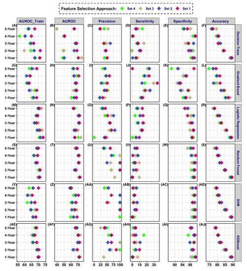 Based on the accuracy, RF (RF, mtry = 14) model, using 26 features (Set3), had the best performance for a 1-year prediction window (accuracy: 90% (95% CI: 86%–92%), PPV: 80%, specificity: 100%). The average accuracy by using the six models and four sets of features was 88% (Table S2, model numbers 1–24). The prediction accuracy decreased as the prediction window widened to 2-years (average accuracy: 85%) with the best accuracy score reached by LR (86%, 95% CI: 82%–89%) and PPV of 80% with a specificity of 99%, Table S2 model number 79. The average accuracy of the 3-year prediction window was 82% for the 4-year prediction window. The average accuracy of the 5-year prediction window was 78%.