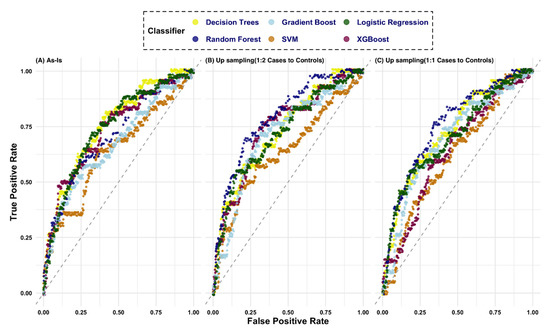 Figure 3. Area under the receiver operating characteristic (AROC) curve using six classifiers for the 1-year prediction window. The feature Set 3 is used for this figure. (A) Model without sampling; (B) Model with up-sampling at a 1:2 ratio; (C) Model with up-sampling at a 1:1 ratio. The best performer model (AUROC of 0.79) is when up-sampling is used with Random Forest algorithm (panel B).