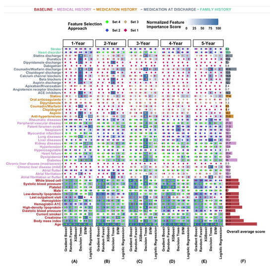 Figure 4. Feature importance based on the different trained models. (AE) Six different classifiers (Gradient Boost, Random Forest, Extreme Gradient Boosting (XGBoost), Decision Trees, Support Vector Machine (SVM), and Logistic Regression) and five different prediction windows were used. (F) Average feature importance score across the different models and prediction windows.