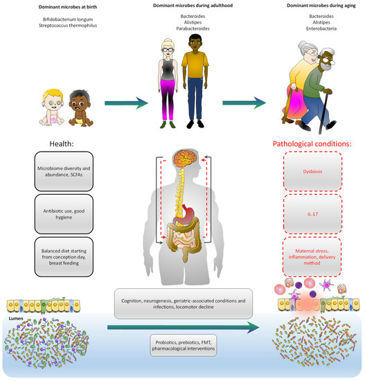 Gut microbiota in health and disease. The gut–brain communication contributes to maintaining a healthy status, which is mainly promoted by some of the factors mentioned on the left side (microbiome diversity and abundance, production of SCFAs, among others). The gut microbiota composition is affected during pathological conditions by some of events mentioned on the right side in red color (dysbiosis and gut produced cytokines, such as interleukin (IL)-17, among others). The relationship between the gut and the brain affects different functions in our body throughout life, such as cognition, neurogenesis, locomotor decline, and so on. The integrity of the gut is disrupted during pathological conditions, increasing intestinal permeability and recruitment of immune cells (right side). In the same line, the composition of dominant microbes during life varies. The use of probiotics, prebiotics, and FMT, among others, has been shown to modulate brain-gut communication, with an optimal time window during postnatal development. SCFAs: short-chain fatty acids, FMT: fecal microbiota transplantation.