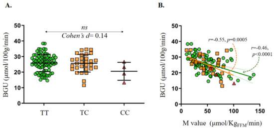 No difference in BGU during insulin stimulation was found between the subjects homozygous or heterozygous for rs17782313-C allele as compared to the carriers of the TT genotype (A). Clamp BGU correlated negatively to the M value in both the subjects carrying the rs17782313-C allele and the carriers of the TT genotype (B). In 1A mean ± SD is given. In 1B the orange line represents the slope and 95% Confidence interval for the grouped TC/CC subjects.