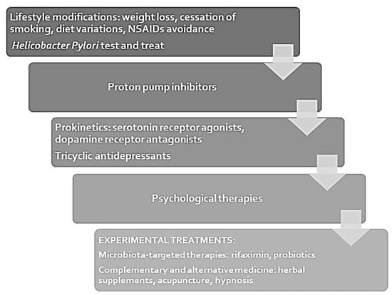 The above discussed therapeutic options for FD are summarized in Figure 1. Together with these pharmacological and non-pharmacological approaches, remains crucial the therapeutic role of lifestyle modifications, such as weight loss in obese patients, cessation of smoking, diet variations, NSAIDs avoidance [10]. These interventions represent the first step in FD treatment and should be associated with any other therapy.