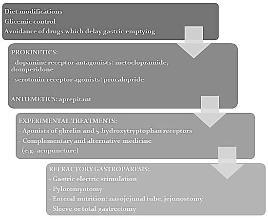 In refractory DG, more invasive therapeutic approaches should be considered and evaluated on a case-by-case basis. These treatments include supplemental nutrition, preferably enteral, administered through a feeding jejunostomy, gastric electric stimulation, pyloromyotomy, and sleeve or total gastrectomy [2,38].