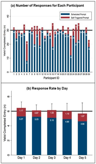 Of the total 900 scheduled EMA prompts (30 prompts × 30 participants), 10 prompts (1.1%) were not provided due to suspected technical problems (6 prompts) or the phone being accidentally turned off (4 prompts from one day of a single participant). A total of 754 out of the 890 provided prompts were completed. The average overall response rate was 84.6 ± 18.5% across participants, which represented an average of 25.1 ± 5.6 completed prompts out of the 30 scheduled prompts. Each participant’s number of responses is shown in Figure 2a (blue bars).