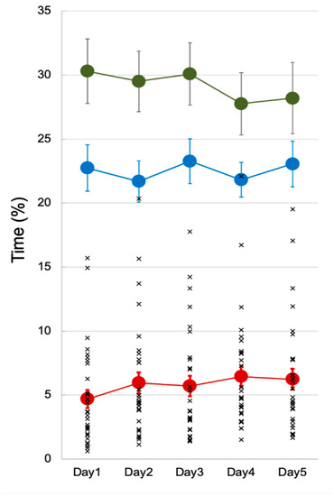 - Accelerometer wearing time: We calculated each participants’ overall and daily accelerometer wearing time to rule out novelty or fatigue effects during the 5 days. If the participant showed “no movement” for any 3-h segment (i.e., the activity counts in every epoch within the 3-h period were <2), we considered that as non-wearing time [8]. Accelerometry data were included in further analyses only when there was a clear indication that both accelerometers were worn.
