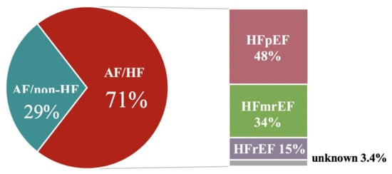 Atrial fibrillation (AF) and heart failure (HF) are two colliding epidemics affecting approximately 1–2% of the world population [], and resulting in significant morbidity and mortality [,]. HF affects overall more than 50% of patients with AF, whilst the prevalence of AF increases proportionally with the severity of the HF, reaching as much as over 50% of patients in New York Heart Association (NYHA) functional class IV []. HF and AF can cause and exacerbate each other through jointly shared risk factors, pathophysiology and mechanisms such as structural cardiac remodeling, activation of neurohormonal mechanisms, and rate-related impairment of left ventricular (LV) function [].