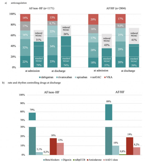 Pharmacotherapy of hospitalized atrial fibrillation patients depending on presence or absence of heart failure and its subtypes. (a) Differences between AF/non–HF vs. AF/HF group were statistically significant for all treatment subgroups (p < 0.05), except no OAC at baseline (p = 0.64), apixaban treatment at baseline (p = 0.29), and no OAC (p = 1.00) at discharge. Differences between AF/non–HF vs. AF/HF group regarding reduced and standard NOAC doses were statistically significant (p < 0.05). (b) Dronedarone was not prescribed in any of the groups. Differences in pharmacotherapy between AF/nonHF vs. AF/HF group were statistically significant (p < 0.05), except amiodarone treatment (p = 0.53). Abbreviations: See Table 1; AAD, antiarrhythmic drug; ndhpCCB, non-dihydropyridine calcium channel blockers, NOAC, non-vitamin K antagonist oral anticoagulant.