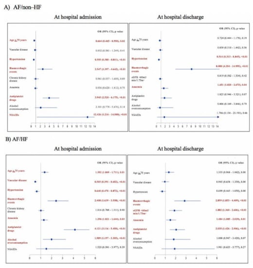 Predictors of non-prescription of oral anticoagulation in atrial fibrillation patients without heart failure (A) and with heart failure (B). Following variables were included in analysis: age ≥ 75 years, female sex (vs male), LV EF < 50% (for the AF/HF group), hypertension, vascular disease (including those hospitalized for acute coronary syndrome for the analysis at discharge), diabetes, previous stroke, previous hemorrhagic events, renal dysfunction (chronic kidney dysfunction for the analysis at hospital admission, and GFR < 60 mL/min/1.73 m2 for the analysis at discharge), liver disease, anemia (hemoglobin < 12 g/dL for women and <13 g/dL for men), antiplatelet therapy (at hospital admission and at hospital discharge for admission and discharge analyses, respectively), alcohol overconsumption and chronic treatment with NSAIDs. Abbreviations: See Table 1; CI, coincidence interval; NSAIDs, non-steroidal anti-inflammatory drugs; OR, odds ratio.