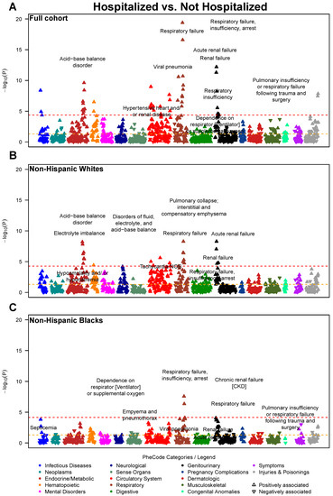 Manhattan plot showing the phenome-wide association between disease conditions and hospitalization for COVID-19. Models are adjusted for age, sex, race (full cohort only), and three census tract-level socioeconomic indicators: proportion with less than high school education, proportion unemployed, and proportion with annual income below the federal poverty level. The x-axis are individual disease codes, color-coded by their corresponding disease category as described in the shared legend. The y-axis represents the −log10 transformed p-value of the association. The dashed, horizontal lines represent the p = 0.05 (in orange) and the Bonferroni corrected p-value (0.05/number of tests; in red). Each point is represented by either an upward triangle indicating a positive association or a downward triangle indicating a negative association. (A): Full cohort, (B): Restricted to Whites, (C): Restricted to Blacks