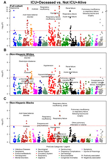 Manhattan plot showing the phenome-wide association between disease conditions and ICU admission for COVID-19. Models are adjusted for age, sex, race (full cohort only), and three census tract-level socioeconomic indicators: proportion with less than high school education, proportion unemployed, and proportion with annual income below the federal poverty level. The x-axis are individual disease codes, color-coded by their corresponding disease category as described in the shared legend. The y-axis represents the −log10 transformed p-value of the association. The dashed, horizontal lines represent the p = 0.05 (in orange) and the Bonferroni corrected p-value (0.05/number of tests; in red). Each point is represented by either an upward triangle indicating a positive association or a downward triangle indicating a negative association. (A): Full cohort, (B): Restricted to Whites, (C): Restricted to Blacks