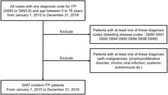 The study population included ITP patients aged <18 years. Diagnoses were coded according to the 7th Korean Classification of Disease (KCD-7), a modified version of the International Classification of Disease-10 (ICD-10). The selection process followed several steps (Figure 1). First, data of patients diagnosed with ITP (KCD-7 Codes D693 or D693.8) as the primary or related disease, from 2015 to 2018, were extracted from HIRA. Next, cases that shared other bleeding disease codes, starting with D69 after the first ITP code, were dropped. These codes were D690, D691, D692, D694, D695, D696, D698, or D699 (Supplemental Table S1). Patients with ITP-associated malignancies, including lymphoproliferative disorders, chronic viral infection, or systemic autoimmune diseases, were classified as secondary ITP, according to an international working group, and were excluded from the study (Supplemental Table S2) [20]. Therefore, a total of 6487 incident ITP cases between 1 January 2015, and 31 December 2018, were included in this study.