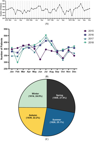 Of the total 6487 patients, 1659 were diagnosed in 2015, 1705 in 2016, 1538 in 2017, and 1585 in 2018. The highest incidence rate in 2015 and 2017 was in April, and in 2016 and 2018, it was highest in June (Supplementary Table S3). The annual cumulative cases per month were the highest in April and lowest in October (Figure 2A,B). ITP patients were most often diagnosed during spring (27.9%), followed by summer (25.1%), winter (24.9%), and autumn (22.2%) (Figure 2C). The average number of cases per month was 135.1. The average number of cases per year between 2015 and 2018 was 1621.8.