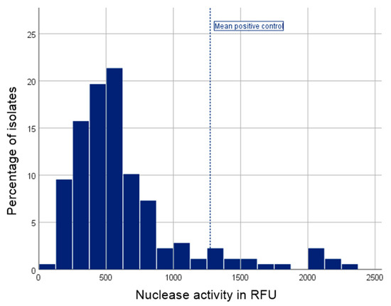 Nuclease activity was highly variable among our clinical SAB isolates (range 97.8–2281.9 RFU, median activity 528.6 RFU). The positive control showed a mean nuclease activity of 1274.4 RFU. The results of the nuclease activity assay are shown in Figure 1.