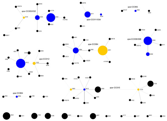 1NF no founder, i.e., related spa types clustered without an identified founder spa type. In the column “spa types”, the number of isolates assigned to each spa type is given in brackets if a spa type was found in more than one isolate. In the column “agr type”, the number of isolates assigned to each agr type is given in brackets if different agr types were found within one spa-CC. MRSA spa types are printed in bold, livestock-associated (LA)-MRSA spa types are underlined.