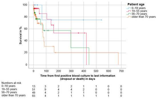 Increasing patient age was the parameter with the most associations to outcome, clinical course, and pathogen features. It was significantly associated with decreased survival, and mortality rates were highest in patients older than 70 years, which is in line with literature findings that describe advanced patient age as the most consistent predictor of mortality in SAB [3,7,27,28]. Old age was also correlated with enhanced disease severity in terms of higher leukocyte and CRP levels in line with earlier literature [27]. Also, methicillin resistance was more frequent in the elderly, which is likely due to a higher rate of healthcare-associated infections in long-term care units and nursing homes as described recently [29,30,31]. Conversely, increasing age was also associated with the administration of inadequate initial therapy in this present study. Despite a greater risk of aggravated infection and poorer outcome, almost one third of patients older than 70 years received inadequate antibiotics in the first week of treatment, which is an alarming finding and highlights the need for improvement of therapeutic management in elderly patients. Also, the application of initial second-line treatment was significantly less common in elderly than in younger patients, although the distribution of MRSA was vice-versa. Pediatric patients received second-line antibiotics in 83.3% of cases, although not a single pediatric patient was infected by MRSA.