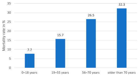 Patient age. Cox regression revealed a hazard ratio of 1.028 for the influence of patient age on overall survival, indicating that the hazard rate increases by 2.8% with each year (p = 0.003, CI 1.010–1.046). The Kaplan-Meier survival analysis showed differences in survival for the four age groups 0–18 years (n = 13, 1 death), 19–55 years (n = 51, 8 deaths), 56–70 years (n = 49, 13 deaths), and older than 70 years (n = 65, 21 deaths). Statistically significant were the differences between the age groups of 0–18 years and over 70 years (Log-Rank p = 0.041); and 19–55 years compared to over 70 years (Log-Rank p = 0.023). For detailed results, see Table 5. The Kaplan-Meier survival estimates are shown in Figure 3. The mortality rates per age group are shown in Figure 4.