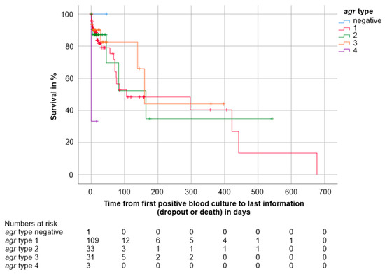 agr type. Kaplan-Meier survival estimates showed that survival of patients infected by isolates of agr 4 (n = 3, 2 deaths, mortality 66.7%) differed significantly from that of patients infected by isolates of other agr types (agr 1: n = 109, 28 deaths, mortality 25.7%, Log-Rank p = 0.0001; agr 2: n = 33, 7 deaths, mortality 21.2%, Log-Rank p = 0.001; agr 3: n = 31, 6 deaths, mortality 19.4%, Log-Rank p = 0.001, missing data of 1 patient). The only non-significant difference was between agr 4 and the one isolate negative for all agr types (n = 1, 0 deaths, Log-Rank p = 0.317). For this analysis, no survival time statistics were computed as all cases were censored. Kaplan Meier survival estimates are shown in Figure 5.