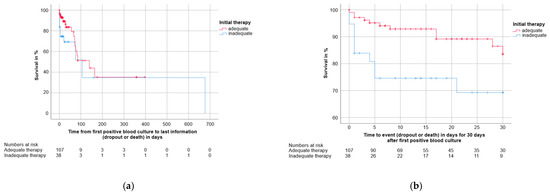 Initial therapy. Kaplan-Meier analysis revealed that overall survival of patients with inadequate initial therapy was worse (n = 38, deaths: 13) compared to patients who were initially treated adequately (n = 107, deaths: 20, Log-Rank p = 0.041, missing data of 33 patients). See Table 6 for detailed results. The survival estimates (shown in Figure 6a) showed an apparent difference between the two groups (patients who were initially treated adequately vs. patients who were initially treated inadequately) especially within the first weeks after drawing the blood culture, suggesting that the highest impact might be on short-term survival. This was confirmed by examining the Kaplan-Meier curves of only the first 30 days (shown in Figure 6b), which revealed an even more obvious difference between the two groups (Log-Rank p = 0.010, missing data of 33 patients). See Table 6 for detailed results.