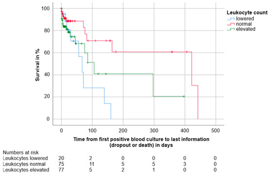 Leukocyte count. Kaplan-Meier analysis showed that elevated, but especially lowered leukocyte counts were detrimental for patient survival. There were 13 deaths in 75 patients with normal leukocyte values compared to 20 deaths in 77 patients with elevated leukocyte counts and nine deaths in 20 patients with lowered leukocyte counts (Log-Rank of survival curves: elevated vs. normal leukocyte counts p = 0.029; lowered vs. normal leukocyte counts p = 0.003, missing data of 6 patients). For detailed results, see Table 7. The Kaplan-Meier survival estimates are shown in Figure 7.