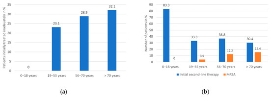 The initial administration of second-line antibiotics was also associated with age. Patients who received second-line antibiotics within the first week of treatment (n = 54) were younger (median 59.5 years, IQR 38.0–73.0 years) than patients who received such antibiotics later or not at all (n = 91, median 65.0 years, IQR 52.0–78.0 years; Mann-Whitney-U test p = 0.023). Furthermore, patients of the age group 0–18 years were significantly more likely to receive second-line antibiotics as initial therapy than patients of all other age groups (administration of second-line antibiotics per age group: 0–18 years: 83.3% of patients (n = 12), 19–55 years: 33.3% of patients (n = 39), 56–70 years: 36.8% of patients (n = 38), older than 70 years: 30.4% of patients (n = 56; Pearson Chi-Square test: 0–18 years vs. 19–55 years p = 0.002, 0–18 years vs. 56–70 years p = 0.005, 0–18 years vs. older than 70 years p = 0.001), missing data of 33 patients). The numbers of patients per age group initially treated with second-line antibiotics are depicted in Figure 8b.