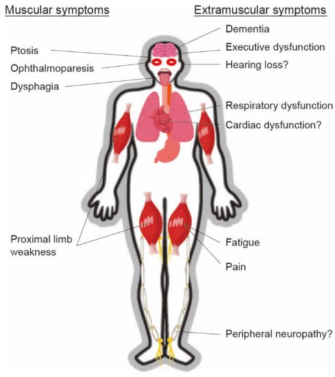 Patients with OPMD can manifest extramuscular symptoms (Figure 1), such as deterioration of respiratory function, including decreased forced expiratory volume in 1 s [30], although cardiac functions may be preserved. Coexistence with dementia [31,32], executive function deficits [33], or peripheral neuropathy [34] was reported. Approximately half of the patients complained of fatigue and pain, and most of the patients were impaired in daily life activities, social participation, and ambulation [35].
