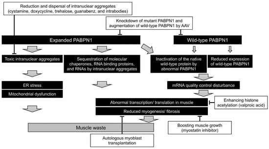 In patients with OPMD, the PABPN1 protein has an extra 11–18 alanine residues in the N-terminus due to the expanded (GCN)n repeats in the exon 1 of the PABPN1 gene. The following underlying mechanisms of OPMD have been speculated: (1) the mutated protein forms intranuclear aggregates, leading to toxicity; (2) the intranuclear aggregates sequester various transcription factors, molecular chaperones, RNA binding proteins, and RNAs necessary for cell maintenance; (3) reduction in the levels of wild-type PABPN1 by half suppresses its native function; or (4) the abnormal PABPN1 protein suppresses the function of wild-type protein [51]. Recent progress in therapeutic strategies for the treatment of OPMD is described below (Figure 2).