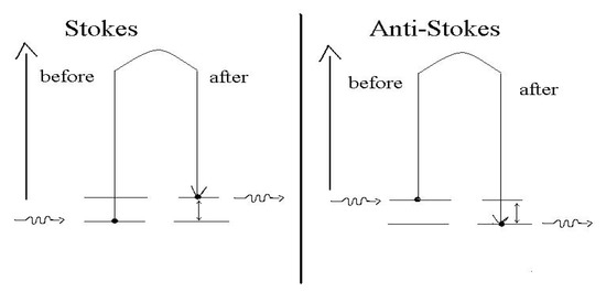 In the Raman spectrum, lower frequency photons give rise to Stokes lines, whereas higher frequency photons are known as Anti-Stokes lines (Figure 2). Usually, the Anti-Stokes lines have small or negligible intensity compared to the Stokes ones, because the population of the excited states is smaller than the one of the fundamental states.