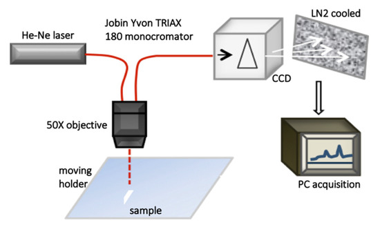 Raman spectroscopy can offer information on the spatial distributions of organic and inorganic compounds in a sample with a spatial resolution of about 1 μm. Furthermore, Raman spectra exhibit little interference with water, making this technique highly convenient for studying many biological specimens, in vivo too. In Figure 3, a schematic representation of a μ-RS experimental setup is reported. This set up has been used for investigating PDL and CGF samples in References [23,25,26,28,29], and it is equipped with a Helium-Neon laser as a light source, coupled to a 50X optical objective. The Raman signal is dispersed by a grating of 1800 grooves/mm and collected by a liquid N2 cooled couple charge detector (CCD), then the data are acquired using a dedicated software.
