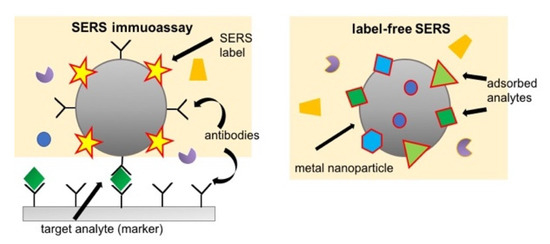 Graphic representation of the two approaches for SERS: the indirect approach (SERS immunoassay) on the left and the direct approach (label-free SERS) on the right.