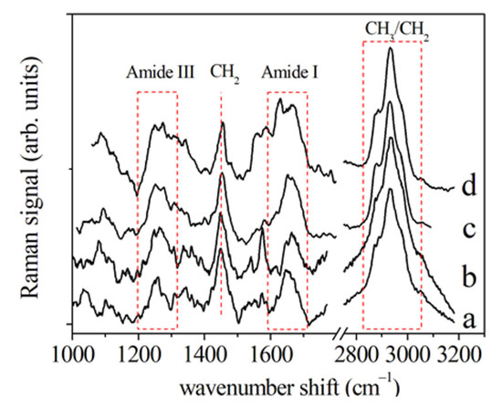 Raman spectra of PDL samples from premolars extracted (a) before, (b) after 2 days, (c) 7, and (d) 14 days of orthodontic treatment. Protein and CH2/CH3 contributions were indicated. (Reprinted with permission from Perillo et al., 2020 under Open Access conditions).