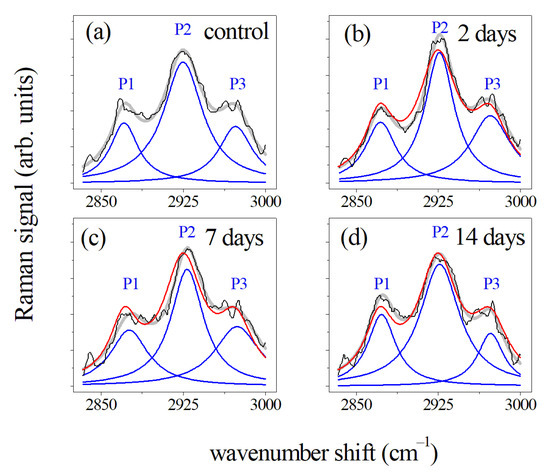Deconvolution of the average Raman spectra of PDL samples collected before (a) and after (b) 2, (c) 7, and (d) 14 days of OTM in the 2800–3000 cm−1 spectral region. Black lines indicated the measured spectra and blue lines are related to the main P1, P2, and P3 Lorentzian components of the Raman band. Fit of the experimental data resulting from the deconvolution process are indicated by gray lines. All the band areas were normalized to 1. In the (b–d) panels the spectra were compared with the Raman response (red line) of the control of (a) panel. (Reprinted with permission from Perillo et al., 2020 under Open Access conditions).