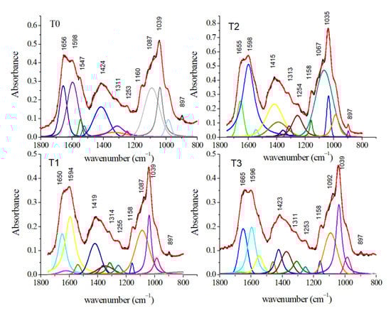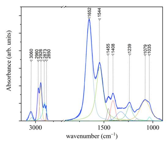 In Figure 9, an average infrared spectrum acquired from PDL samples collected before OTM is reported. In this Figure also the results of the deconvolution procedure performed by using Lorentzian–Gaussian curves is shown.