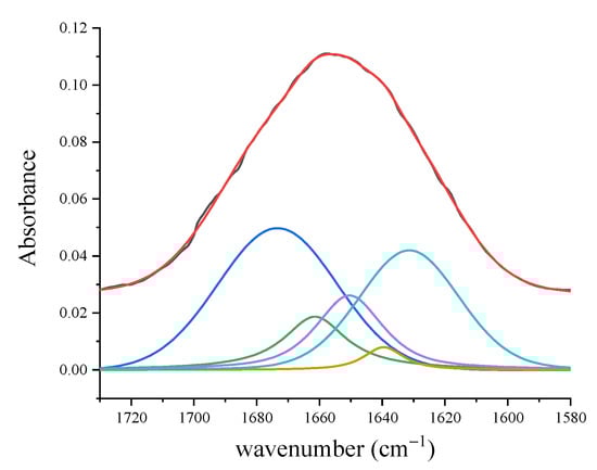 Spectrum of PDL in the Amide I region (1710–1580 cm−1) (black line). Colored lines indicate the different contributions obtained by the deconvolution analysis of peaks using Lorentzian–Gaussian curves. Fit of the experimental data resulting from the deconvolution process is indicated by the red line. (Reprinted with permission from Portaccio et al., 2019).