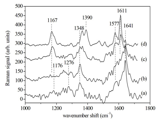 The μ-Raman analysis was performed on the GCF paper points without any sample manipulation in order to develop an effective approach for monitoring the processes occurring during OTMs. The Raman spectra of the GCF collected using paper cones showed similar features observed in the SERS spectrum above (see Table 3). Much information was obtained by analyzing the 1500 to 1750 cm−1 region where the Amide I band is located. In agreement with the SERS results, also μ-RS results show that the center of the band moved toward shorter wavenumber shifts in the days after the beginning of the treatment. As said before these results are not in complete agreement with the outcomes reported by Jung et al. [24] (see Figure 13). This discrepancy cold be due to different modalities in experimental procedure.