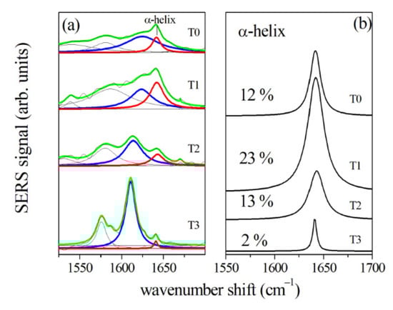 More detailed information can be obtained also in this case from the Amide I band deconvolution (Figure 12). During the OTM, the center of the Amide I band moves toward shorter wavenumber shifts, specifically for T2 and T3 spectra. These changes are related to the decrease in the α-helix subcomponent (located around 1640 cm−1) and the increase in the β-sheet subcomponent (located in the range between 1610 and 1625 cm−1). The percentage of α-helix subcomponent to the Amide I band was evaluated by estimating the ratio of areas of the α-helix peak and the whole Amide I band, and it is shown in Figure 12b for the different stages of the OTM. The present results of the