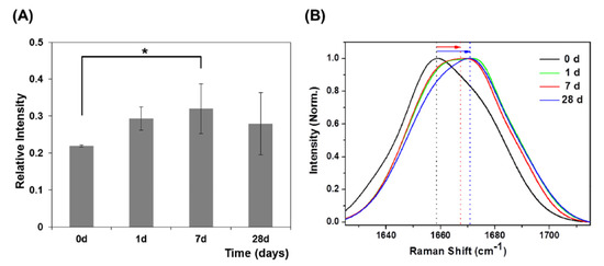 (A) Relative intensities in 1667 cm−1 Raman peaks during OTM. * Significantly different from day 0 (p < 0.05, one-way ANOVA with Turkey’s Honest Significance Difference (HSD) post-hoc procedure). (B) Normalized average GCF Raman spectra in the 1625–1715 cm−1 range during OTM. (Reprinted from Jung et al. 2014 under Open Access conditions).