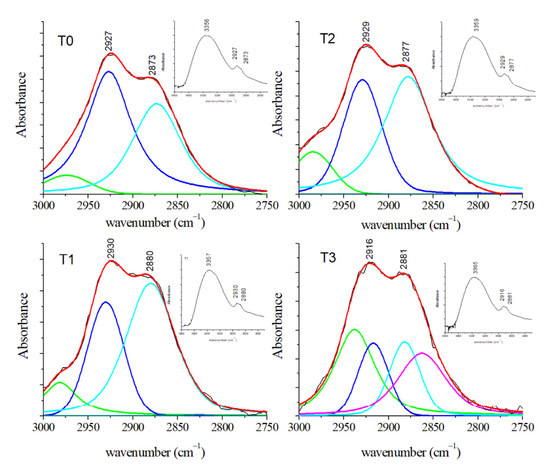 Average FT-IR spectra of GCF samples obtained from patients before (T0) and during OTM in the 3000–2750 cm−1 spectral region (black lines). The deconvolution analysis of peaks with Gaussian–Lorentzian curves is shown by colored lines. Red lines indicated the fitted spectra. (Reprinted with permission from Portaccio et al., 2019).