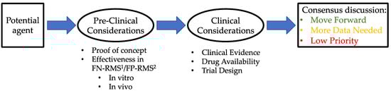 The RMS task force modified the framework created by the Ewing sarcoma task force to define the key criteria specific to RMS to systematically identify and evaluate new agents based on clinical and non-clinical criteria (Figure 1) [16].