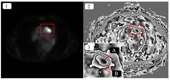 Result of the transformation of a single positron-emission tomography (PET) DICOM image of the lung using the pre-processing method for contouring the uptake levels of 18F-fluorodeoxyglucose ([18F] FDG) (PCUL-FDG) method. In both versions of the axial projection image, the red rectangle marks an area with increased [18F] FDG uptake in a pulmonary nodule within a 3.3-mm-thick layer. (1) Original image, (2) transformed image, (3) close-up of the section marked with red, where A: maximum [18F] FDG uptake, B: nested uptake contours.