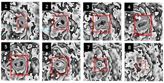 Maximum [18F] FDG uptake (maximum emission)—the area where the highest [18F] FDG uptake values were recorded; a small-sized area, noticeable as a white dot surrounded with a black band, usually inside the most nested contour, with the exception of contours that are not nested individually and where, within a given contour, there are many areas of other nested or non-nested contours (Figure 2)—in such a case, maximum uptake may not be located in the most nested contour.
